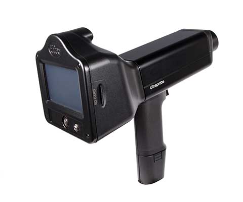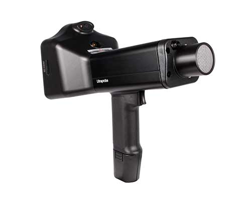 Ultraprobe gun-style main body with touchscreen panel, headphone jack, SD card & module slots, integrated IR temperature sensor, digital camera, laser pointer, onboard spectralyser, and data transfer functions
